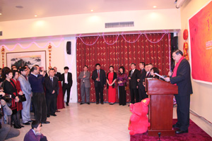 6點30分,招待會在歡快的樂曲聲中開始。張大使首先向參加招待會的所有來賓拜年,并委托他們向各自家人和其他華人朋友轉達新春祝福。他說,2010年,全國各族人民在黨中央、國務院的領導下,不斷取得驕人業績,綜合國力又有了明顯提升,已成為世界第二大經濟體;通過抗擊自然災害,成功舉辦上海世博會和廣州亞運會,并沉著應對復雜的國際形勢,中國向世界展示了一個堅定自信、開放包容、進步友好的大國形象。2010年也是中比關系的豐收年,兩國在政治、經貿、文化、教育、科技以及其他領域的交流和合作取得新的進展。張大使指出,廣大旅比僑胞在積極融入當地社會的同時不忘故土,當國內發生自然災害時,紛紛伸出援手,對貧困地區的人民慷慨解囊,令人感動,他再次代表使館表示感謝。張大使還介紹了不久前胡錦濤主席對美國進行的國事訪問,指出在這次影響深遠、成果豐碩的國事訪問中,雙方全面規劃了今后一個時期發展關系的重點方向和深化合作的重點領域,確認雙方共同努力,建設相互尊重、互利共贏的合作伙伴關系。張大使表示,2011年是中國十二五規劃的開局之年,同時也將迎來中比建交40周年,他呼吁大家以更加扎實的努力,實現中比友好合作關系躍上新臺階。
