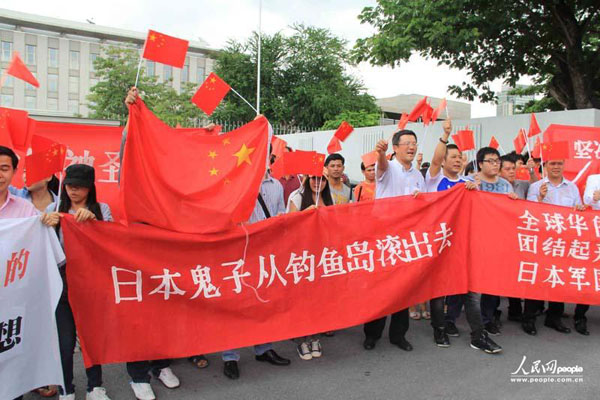 人民網曼谷9月11日電(記者 于景浩 孫廣勇)11日下午,約100多人泰國華人華僑自發來到日本駐泰國大使館前舉行和平抗議,抗議日本政府宣布所謂“國有化”我釣魚島的非法行為。泰國中國和平統一促進會、泰國福建商會以及愛國華僑華人約100多人,高舉中國國旗,以及“釣魚島是中國的”、“堅決反對日本侵占釣魚島”等標語,高呼“日本滾出釣魚島”等口號,示威大約持續了一個半小時左右。泰國統促會還向日本使館遞交了題為《堅決反對日本強占我領土》的抗議書,一名日本使館人員出面接受了這份抗議書。