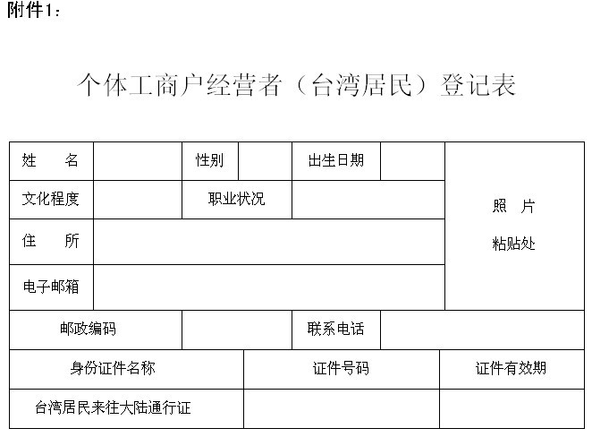 附件:1.《個體工商戶經(jīng)營者(臺灣居民)登記表》