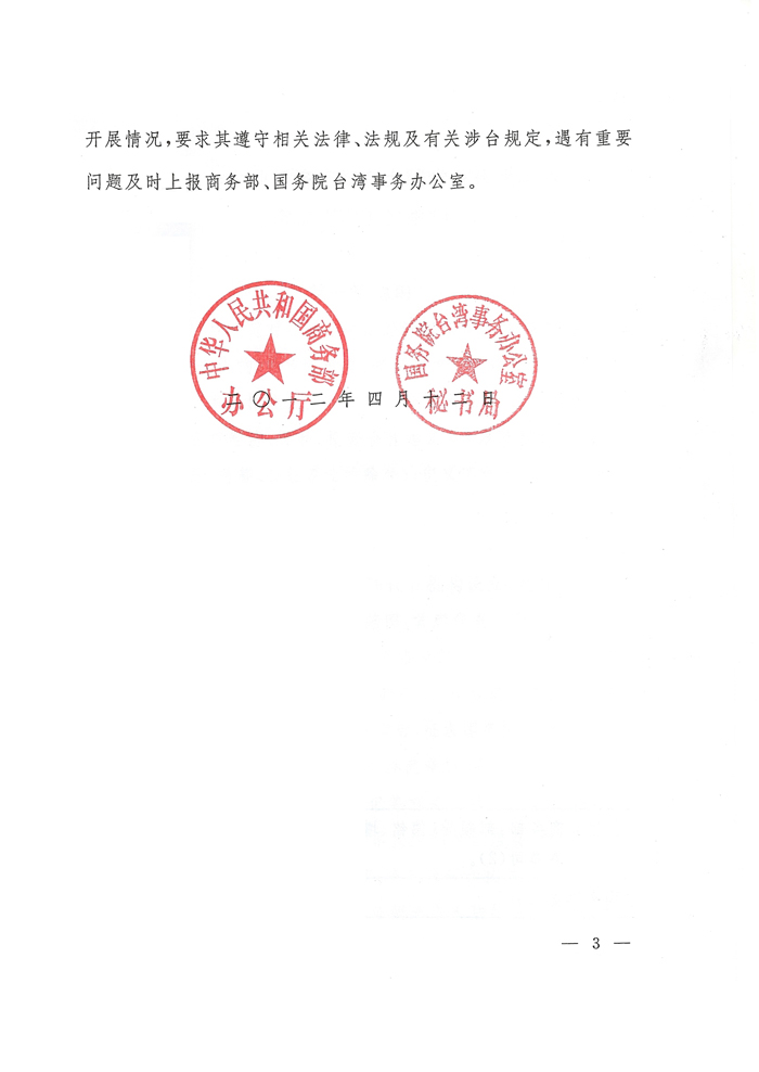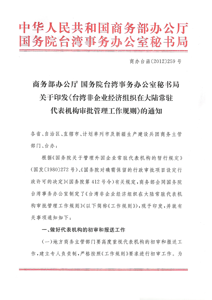 商務(wù)部辦公廳 國(guó)務(wù)院臺(tái)灣事務(wù)辦公室秘書局關(guān)于印發(fā)《臺(tái)灣非企業(yè)經(jīng)濟(jì)組織在大陸常駐代表機(jī)構(gòu)審批管理工作規(guī)則》的通知(2012.04.16)