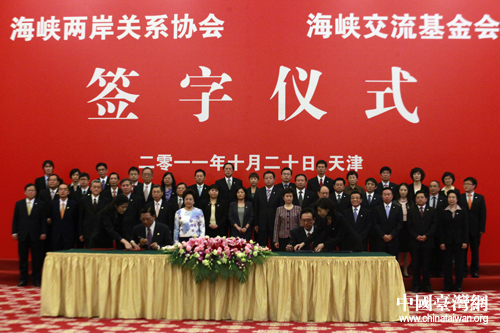 海協會會長陳云林與臺灣;鶗麻L江丙坤20日下午2點30分在天津簽署了《海峽兩岸核電安全合作協議》。(中國臺灣網 陳佳慧 攝)