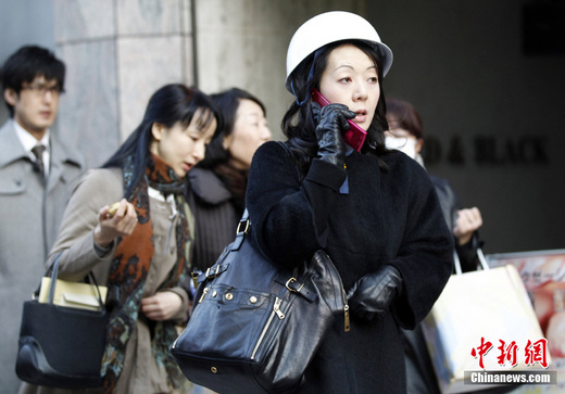 日本近海3月11日發(fā)生了強(qiáng)烈地震,首都東京震感強(qiáng)烈。日本氣象廳隨即發(fā)布了海嘯警報,稱地震將引發(fā)約6米高海嘯。圖為東京市金融區(qū)一女子從建筑物內(nèi)疏散后頭戴安全帽在打電話。