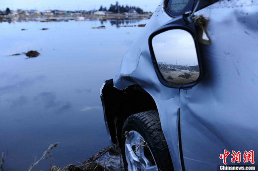 3月14日下午,中新社記者親赴被日本東北大地震引發(fā)的大海嘯襲擊的宮城縣仙臺(tái)市若林區(qū),深入災(zāi)后現(xiàn)場(chǎng)。這是一輛被沖入農(nóng)田的汽車,后視鏡中映出災(zāi)后景象。中新社發(fā) 侯宇 攝