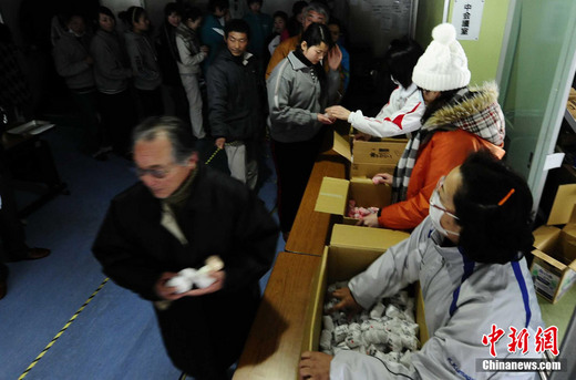 3月16日,在日本巖手縣大船渡地區公民會館避難的民眾排隊領取食物。中新社發 侯宇 攝