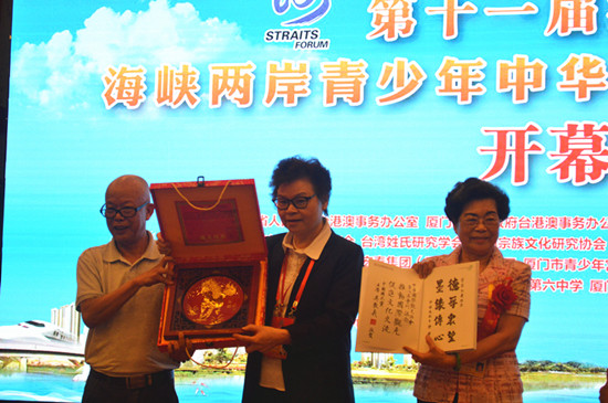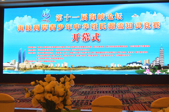 6月14日晚,第十一屆海峽論壇·海峽兩岸青少年中華姓氏源流知識競賽開幕式在廈門華僑大廈(大酒店)舉行。來自海峽兩岸的參賽選手、觀摩師生以及兩岸民間社團嘉賓參加了開幕式暨歡迎晚宴,相關單位領導蒞臨現場。廈門市姓氏源流研究會會長陳淑娥、臺灣姓氏研究學會榮譽理事長林培圣、金門宗族文化研究協會理事長葉鈞培、臺灣中華國際觀光協會理事長詹秀蓉分別致辭,廈門市政協副主席陳昌生對大賽的成功舉辦給予美好祝愿。開幕式上,《廈門與臺灣姓氏文化》一書首發儀式舉行,海峽兩岸民間社團互贈紀念品。