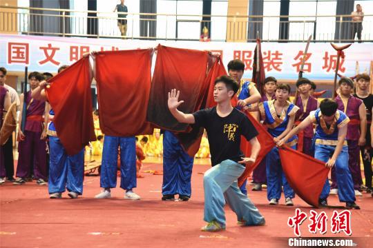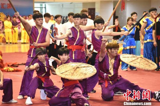 臺灣龍華科技大學在獅陣大匯演中展示氣勢磅礴的宋江陣藝以及精彩絕倫的武藝,引發觀眾們大聲喝彩。據悉,該宋江陣將五行相生相克之意象融入宋江陣創意表演,并加入旗、扇及大鼓等多種道具,融入中國武術和戰鼓的概念,重新演繹宋江陣磅礡的表演陣勢。