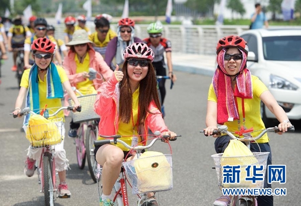 6月12日,兩岸大學生代表在廈門五緣灣參加兩岸青年騎行活動。當日,由中華全國青年聯合會等聯合主辦的“情系海峽龍行天下”2015年兩岸青年騎行活動在廈門五緣灣舉行,來自海峽兩岸的200多名青年參加了騎行活動。 新華社記者姜克紅攝
