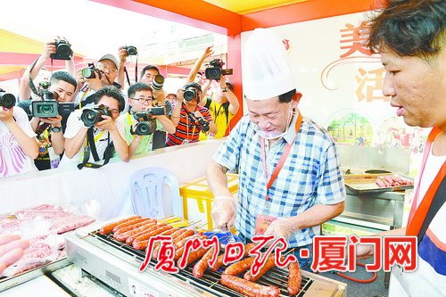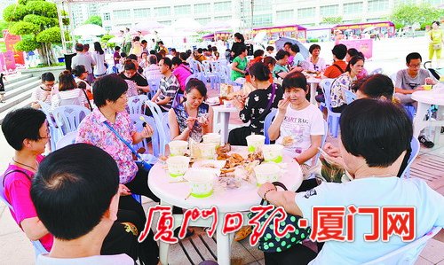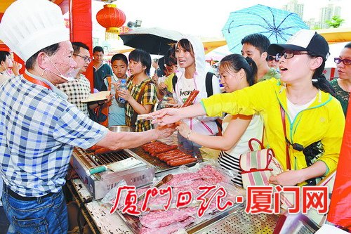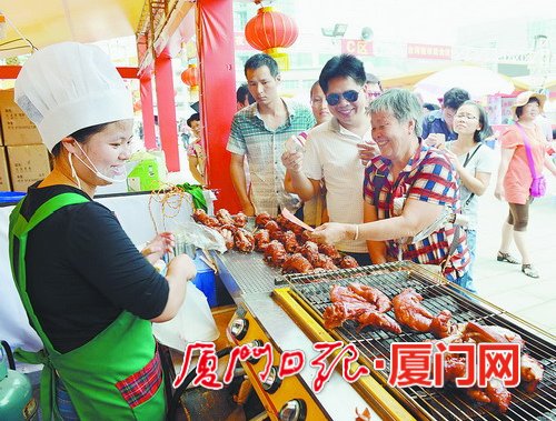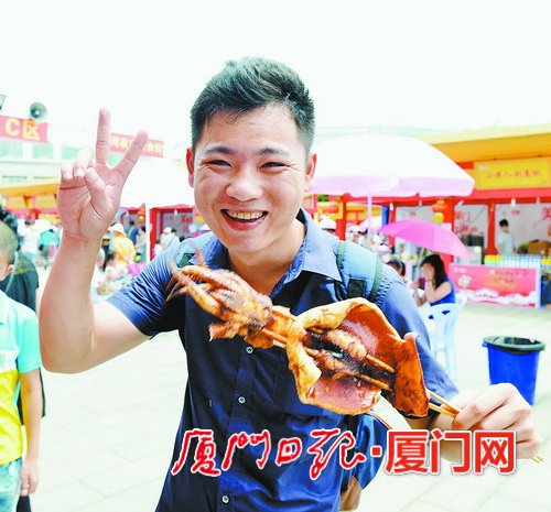 “前兩屆廟會我們都來參加,品嘗了許多‘古早味’臺灣美食。今年的廟會又帶來了更多的驚喜!眮碜詬u內的市民林先生一邊啃著萬鸞醬烤豬腳,一邊對記者說。放眼望去,整個海滄市民文化廣場熙熙攘攘,成了一片歡樂的海洋。
