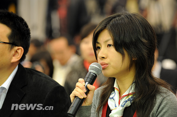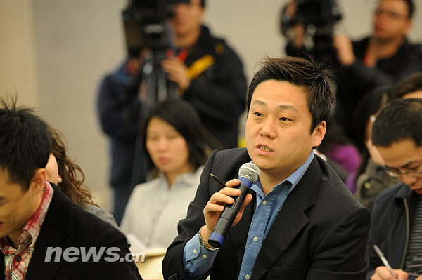 圖為臺灣東森電視臺記者提問。新華網(wǎng) 文濤 攝