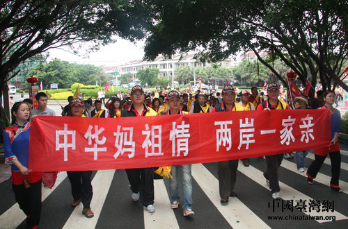 來自臺灣的媽祖信眾代表手持“中華媽祖情、兩岸一家親”的標語走向天后宮。(中國臺灣網 郭瑩瑩 攝)