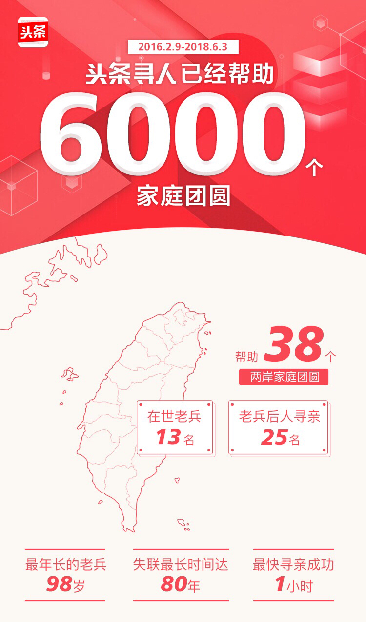 目前為止,今日頭條兩岸尋親項目已經幫助38個兩岸家庭團圓,當中有25個成功案例是赴臺老兵的后人尋找大陸親屬,占比達2/3;另有13位是赴臺老兵本人尋親。這些健在的老兵當中。年紀最大的已經98歲,跟家鄉親人失聯時間最長的有80年;尋親速度最快的一個案例,頭條尋人僅用了1個小時,就幫助老兵尋找到了大陸的親人。