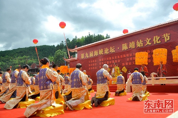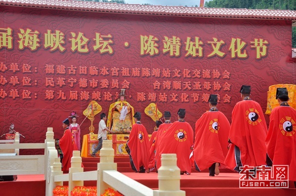 當天上午9時整,祭祀典禮儀式拉開了陳靖姑文化節的序幕。在陳靖姑金身像前,參祭人員循禮興、上馨香、獻三牲、三獻爵、敬頌祭文、行“三跪九叩”禮以及獻樂舞等傳統禮儀,依序展開祭典,兩岸民眾虔誠進香祭拜。