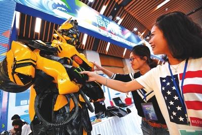 圖為“享·雙創(chuàng)”兩岸文化科技創(chuàng)意展,參展商代表在和機(jī)器人互動(dòng)。(福建日?qǐng)?bào)記者林輝 攝)