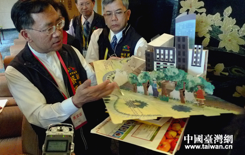 臺中市副市長蔡炳坤向記者展示臺中孩子們親手做的立體百科書。(中國臺灣網 高斯斯 攝)