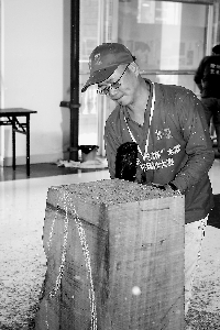 臺灣木雕工藝家曾安國在比賽現場進行創作。