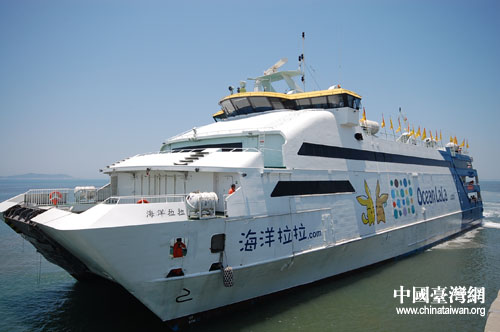 臺灣媽祖信眾直航湄洲進香團乘坐的“海洋拉拉號”今天下午抵達湄洲碼頭。(中國臺灣網記者 徐麗麟攝)
