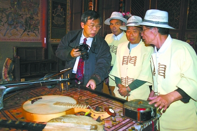 圖為與會(huì)學(xué)者(左)向泉港區(qū)北管藝人了解北管樂(lè)器。