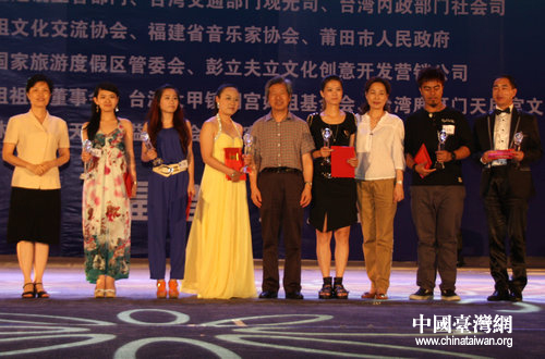 在第三屆海峽兩岸媽祖歌曲青年歌手大獎賽頒獎晚會上,嘉賓向獲獎選手頒發(fā)獎杯及獲獎證書。(中國臺灣網(wǎng) 張潔 攝)