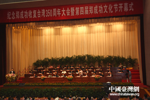 “紀(jì)念鄭成功收復(fù)臺灣350周年大會暨第四屆鄭成功文化節(jié)”今天上午在廈門市人民會堂開幕。全國政協(xié)副主席、全國工商聯(lián)主席黃孟復(fù),國家文化部副部長楊志今,國務(wù)院臺灣事務(wù)辦公室主任助理龍明彪等出席開幕式。