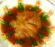8. 炒鍋置旺火,下豬油燒熱,放入面粉煸至乳白色時,倒入白湯煮沸,調以醬油、味精,徐徐澆在魚翅上,再鋪上蒸熱的火腿片即成。