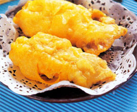 操作: 1、將魷魚清洗干凈,蔥、姜洗凈切成末。 2、取一器皿放入蔥姜末、胡椒、料酒、糖、鹽、海鮮醬、雞精調(diào)成汁,魷魚用竹簽串起來放入調(diào)好的汁中腌制20分鐘,再裹上淀粉。 3、坐鍋點(diǎn)火放入油,油熱倒入魷魚,炸至變色撈出瀝干油,再放入鍋中炸至金黃色撈出擺入盤中即可。