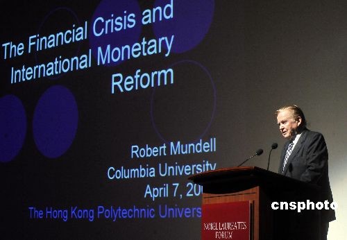 四月七日,香港理工大學舉行“諾貝爾得獎者論壇”。諾貝爾經濟學獎得主羅伯特·蒙代爾教授應邀出席論壇,圖為在論壇上羅伯特·蒙代爾教授以“金融危機及國際貨幣改革”為講題演講。 中新社發 鄧慶樂 攝