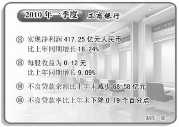 工商銀行2010年第一季度實現凈利潤417.25億元人民幣,比上年同期增長18.24%,每股收益為0.12元,比上年同期增長9.09%。