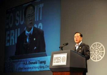 將于下月出席亞太經(jīng)合會(huì)議的曾蔭權(quán)表示,會(huì)就規(guī)管評(píng)級(jí)公司、對(duì)沖基金等提出意見(jiàn)。圖為曾蔭權(quán)去年在同一會(huì)議上發(fā)表演說(shuō)。(圖片來(lái)源:大公報(bào))