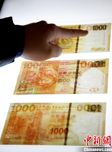 中新網11月25日電 據香港星島日報報道,香港金管局聯同三家發鈔銀行,將于下月七日推出新設計的一千元鈔票供巿民兌換。首批七千多萬張新鈔票,會由三家發鈔銀行分批發行,舊款鈔票仍然流通。新一千元鈔票共有八項防偽特征,香港印鈔有限公司特別購入新機械及貴價油墨印制新鈔,造出移動鈔票時有一條光紋于圖案上下滾動的效果;新鈔紙質較厚,會更耐用,“壽命”可延長三成。