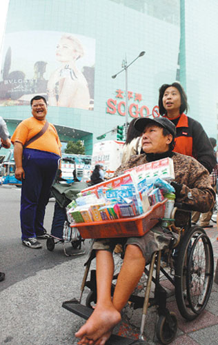 臺北市百貨公司廣場前,一名坐輪椅的中年男子兜售雜貨,兩相對照更凸顯臺灣貧富差距越來越大。 圖片來源:臺灣《聯合報》