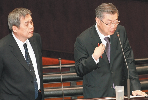 臺當局行政主管部門負責人陳沖(右)昨天在臺立法機構表示,勞保基金有破產風險,臺當局一定會負責任解決;左為臺“勞委會主委”潘世偉。圖片來源:臺灣《聯合報》