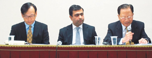 ING安泰投信董事長鄒鴻圖(右起)、總經理毛昱文、執行副總賴峰彰昨天出面,為前基金經理人不當操作盈正案致歉,安泰投信破天荒賠償臺當局基金與三檔共同基金約2.5億元(新臺幣,下同)虧損。圖片來源:臺灣《聯合報》