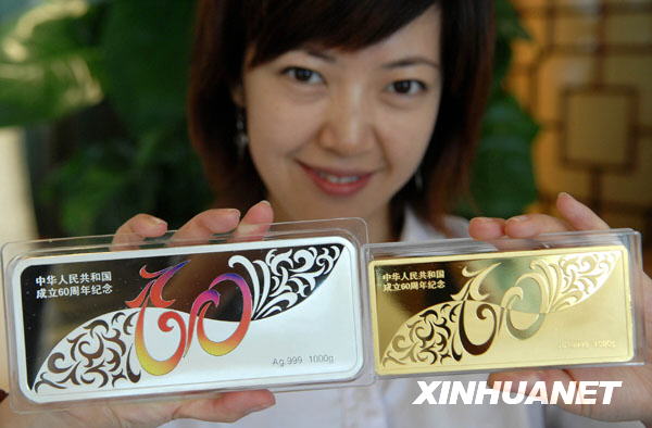 7月14日,工作人員展示新中國成立60周年紀念金銀條鳳舞系列。由中國印鈔造幣總公司制造發行、中鈔國鼎公司總經銷的中華人民共和國成立60周年紀念金銀條,將于7月23日在北京菜百商場首發。該套產品分為龍騰系列和鳳舞系列。新華社發