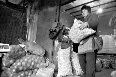 某農貿批發市場一位大蒜批發商正在搬運大蒜。新華社記者王菲攝