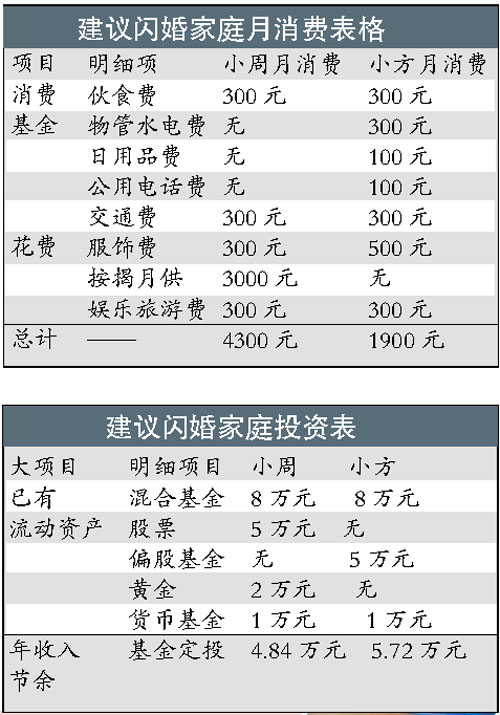 半年之前,廣州白領小周、小方在朋友聚會上一見鐘情,決定“閃婚”。小周27歲,是某外資企業的工程師,年薪10萬元,現有公寓一套,月供3000元,還差7年才供完;另有銀行存款11萬元,股票5萬元。小方26歲,是某國企的財務人員,年薪8萬元,現有基金10萬元,現金4萬元,無自有住宅,搬來與小周一起住。請教理財人士,兩人該如何理財?
