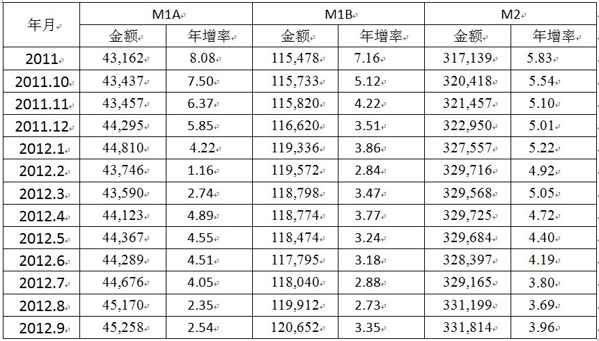 2012年1-9月 M2年增率為4.44%,M1A年增率為3.45%,M1B年增率為3.26%。
