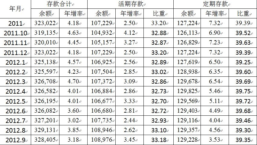2.金融機(jī)構(gòu)存款增速先升后降,定期存款增速幅度下降明顯。臺(tái)灣金融機(jī)構(gòu)存款年增率由2011年12月的4.18%小幅度上升至2012年3月的4.70%,其后逐步下降至9月的3.18%最低值。不同類別的存款皆出現(xiàn)正增長(zhǎng),但增長(zhǎng)幅度差異較為明顯。其中活期存款增速較為穩(wěn)定,一直維持在3%左右,占存款總額的比重由1月的32.89%小幅上升至9月的33.18%;定期存款年增率則出現(xiàn)明顯下滑趨勢(shì),年增率由1月的6.5%逐步下降至9月的3.53%,占存款總額的比重則先升后降最后略有回升,由1月的39.25%小幅增加到9月的39.35%。