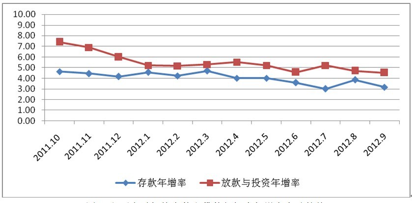 3.金融機(jī)構(gòu)貸款與投資增速下降,證券投資年增率大幅上揚(yáng)。2012年1-9月臺(tái)灣金融機(jī)構(gòu)貸款與投資余額依舊保持正增長(zhǎng)態(tài)勢(shì),貸款與投資余額由1月的243944新臺(tái)幣億元增加到9月的250140億元,但年增率呈下降趨勢(shì),主要是經(jīng)濟(jì)形勢(shì)不佳所致。其中貸款量相對(duì)平穩(wěn),年增率由1月的4.53%逐步下降至9月的2.38%;而證券投資每月平均年增率卻呈現(xiàn)大幅上揚(yáng)趨勢(shì),由1月的9.86%逐步上升至9月的19.00%。存貸款年增率差距在7月間達(dá)到最大,其它時(shí)間都維持在2%以內(nèi)。