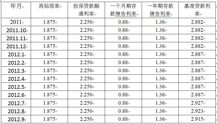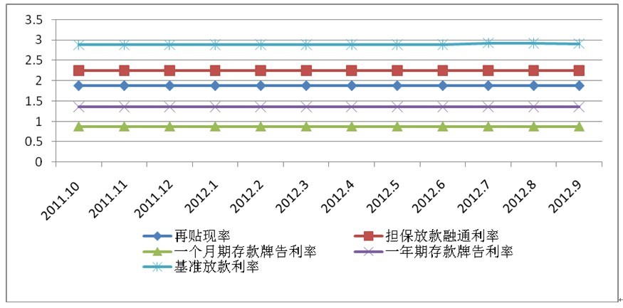 4.銀行業(yè)利率保持穩(wěn)定。再貼現(xiàn)率、擔(dān)保貸款融通利率一直維持在2011年的平均水平上,分別為1.875%和2.25%。以臺(tái)灣銀行、合作金庫(kù)銀行、第一商業(yè)銀行、華南商業(yè)銀行和彰化銀行五大行庫(kù)為例,一個(gè)月期存款牌告利率和一年期存款牌告利率也分別保持了穩(wěn)定水平,分別為0.88%和1.36%,基準(zhǔn)貸款利率則有所上調(diào),2012年1月略有上調(diào),7月再上調(diào)至2.927%,9月回調(diào)至2.915%。