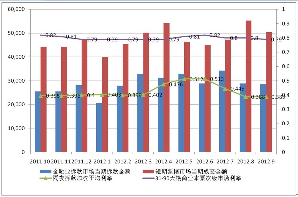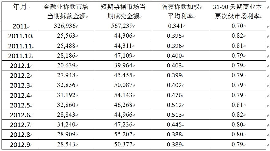 2012年1-9月貨幣市場(chǎng)拆借交易并不十分活躍,貨幣市場(chǎng)成交金額出現(xiàn)波動(dòng)。其中金融業(yè)拆款市場(chǎng)當(dāng)期拆款金額1-3月出現(xiàn)小幅增長(zhǎng),4-6月先升后降,7-9月又出現(xiàn)小幅下降。短期票據(jù)市場(chǎng)當(dāng)期成交金額則出現(xiàn)兩次先升后降態(tài)勢(shì),分別在4月和8月增長(zhǎng)到峰值。再貼現(xiàn)率和擔(dān)保貸款融通利率分別維持在1.875%和2.250%。1-9月金融業(yè)隔夜拆款平均利率從2月開(kāi)始小幅上揚(yáng),6月上漲至0.513%的水平,后又逐步下降至0.389%。短期票券市場(chǎng)利率則呈現(xiàn)出更穩(wěn)定狀態(tài),31-90天期商業(yè)本票次級(jí)市場(chǎng)利率在1-9月基本保持在0.8%左右。