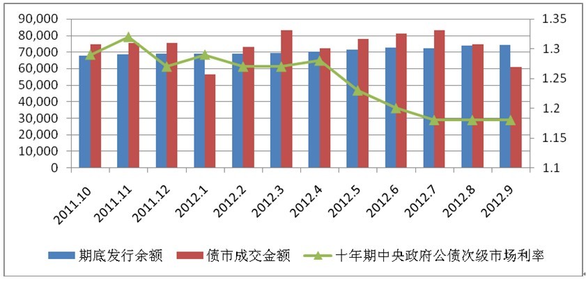債券市場(chǎng)交易量萎縮,債券殖利率大幅下降。國(guó)際金融危機(jī)影響繼續(xù)發(fā)酵,受收益率水平影響,2012年臺(tái)灣債券市場(chǎng)繼續(xù)保持萎靡狀況。十年期“中央政府”公債次級(jí)市場(chǎng)利率1-4月長(zhǎng)期在1.27%較低水平徘徊,進(jìn)入5月后,債券殖利率大幅下降,一直跌倒7月1.18%才保持穩(wěn)定。債券期底發(fā)行余額2012年保持了小幅逐步上升的態(tài)勢(shì),由1月的68854億元逐步上升至9月的74404億元。債市成交金額在1-9月間兩次呈現(xiàn)先升后降態(tài)勢(shì),由1月56448億元逐步升至3月的83005億元,4月降至72416億元,5月重新開(kāi)始上漲至7月的83307億元,后又逐步下降至9月的61137億元新臺(tái)幣。