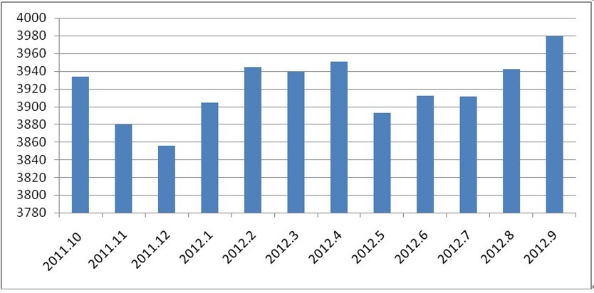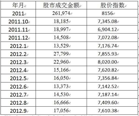 臺(tái)股指數(shù)先揚(yáng)后挫,大體處于低位盤整。受世界經(jīng)濟(jì)持續(xù)低迷影響,臺(tái)股指數(shù)2011年11月跌破7000點(diǎn)大關(guān),后在2012年初島內(nèi)“大選”的利好前景激勵(lì)下,股指不斷提升,3月份突破8000點(diǎn)大關(guān)。其后一路下跌,從3月的8020點(diǎn)一路下跌至6月的7142點(diǎn)。導(dǎo)致此輪重挫的利空因素包括:證交稅施行、油電雙漲等因素。7-9月股指有所回升,由7187.14點(diǎn)逐步上升至9月的7610.38點(diǎn)。
