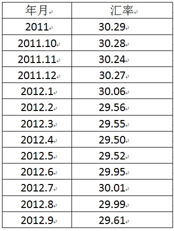 2012年1-9月平均匯率為29.731