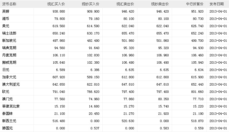 人民幣牌價(jià)(2013.4.1)