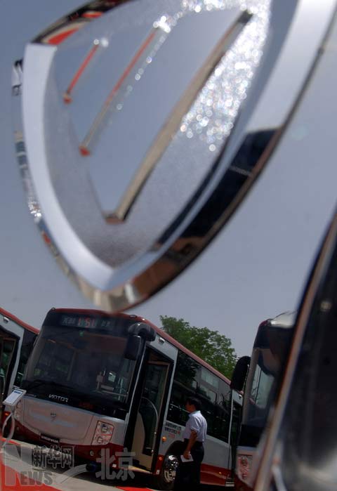 6月20日,北京福田汽車標(biāo)志上倒映出參觀者在觀看歐V混合動(dòng)力客車的情形。 新華社記者公磊 攝 |
