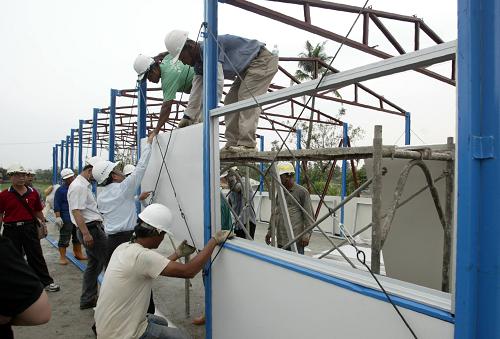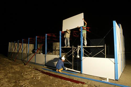 8月20日,大陸援助臺灣臺風(fēng)“莫拉克”災(zāi)區(qū)的首批活動板房已運(yùn)抵受災(zāi)嚴(yán)重的屏東縣佳冬鄉(xiāng),當(dāng)?shù)毓ぷ魅藛T已開始試裝工作。新華社發(fā)