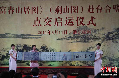 5月11日,《富春山居圖》(剩山圖)赴臺合璧展覽點交啟運儀式在浙江省博物館武林館區舉行。作為浙江省博物館鎮館之寶的《富春山居圖》(剩山圖),這是第一次離館赴境外展覽。圖為浙江省博物館講解員講解《富春山居圖》。中新社發 汪恩民 攝
