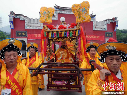 6月1日,應澎湖縣縣長王乾發、澎湖縣王氏宗親理事會盛邀,福州市晉安閩臺王審知研究會訪問團一行76人,在福州蓮花山閩王紀念館舉行隆重起駕儀式,護駕閩王金身赴澎湖會香進行為期7天的交流訪問。中新社發 劉可耕 攝