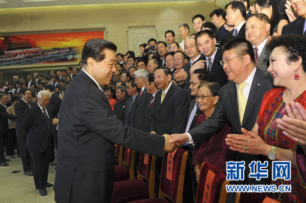 6月19日,中共中央政治局常委、全國政協主席、中國和平統一促進會會長賈慶林在北京會見出席中國和平統一促進會八屆二次理事大會的全體代表。新華社記者 饒愛民 攝