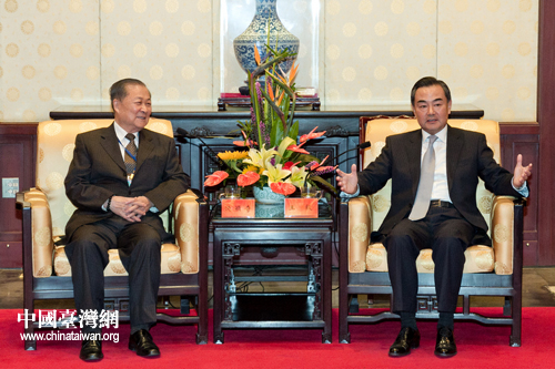 9月3日晚,中共中央臺辦、國務院臺辦主任王毅在北京會見海峽兩岸民意交流基金會董事長饒穎奇先生率領的“臺灣民意代表交流參訪團”一行。(中國臺灣網發 鄧鴻偉攝)